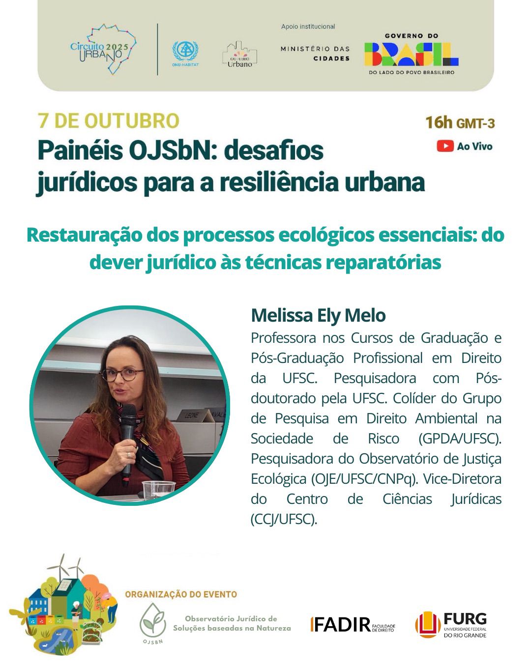 📆 No dia 7 de outubro, às 16h (GMT-3), dentro da programação dos Painéis OJSbN, teremos a participação da Profa. Melissa Ely Melo (UFSC) com a palestra: “Restauração dos processos ecológicos essenciais: do dever jurídico às técnicas reparatórias”.